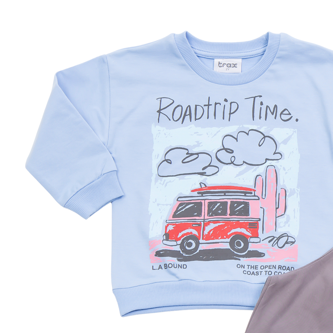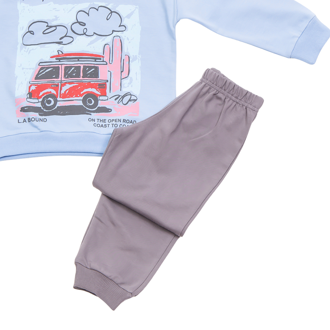 Σετ φορμα εποχης, λεπτή, αχνουδιαστη, της εταιρείας Trax, με παντελόνι φόρμας σε χρώμα ανθρακί και μπλούζα μακρυμάνικη σε χρώμα σιέλ με τύπωμα. 100% Cotton