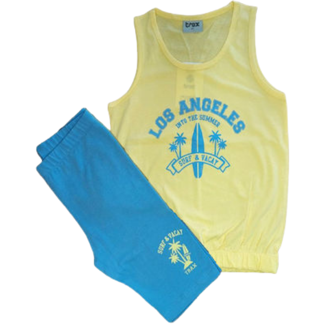 Σετ παιδικό, της εταιρείας Trax , με κολάν σε χρώμα σιέλ και μπλουζάκι αμάνικο σε χρώμα κίτρινο με τύπωμα "LOS ANGELES"