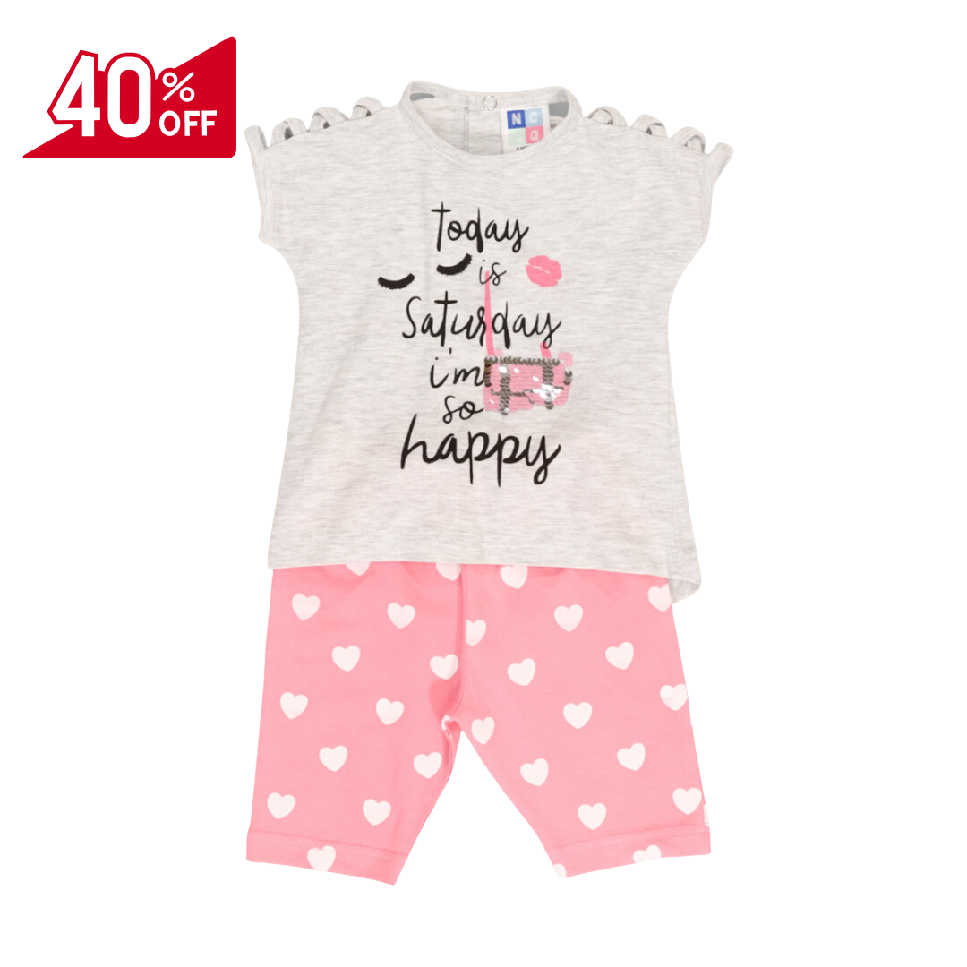 Βρεφικό σετ για κορίτσι, της εταιρείας New College, καλοκαιρινό, με κολάν ποδηλατικό σε χρώμα ροζ με λευκές καρδούλες και μπλουζάκι, με όμορφο σχέδιο στους ώμους σε χρώμα γκρι και τύπωμα "Today is Saturday I' m so happy".