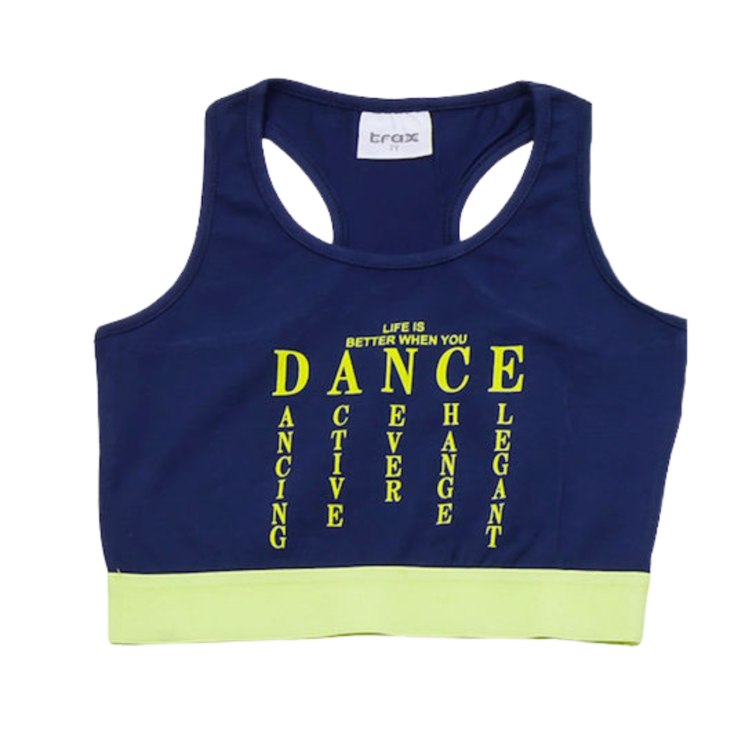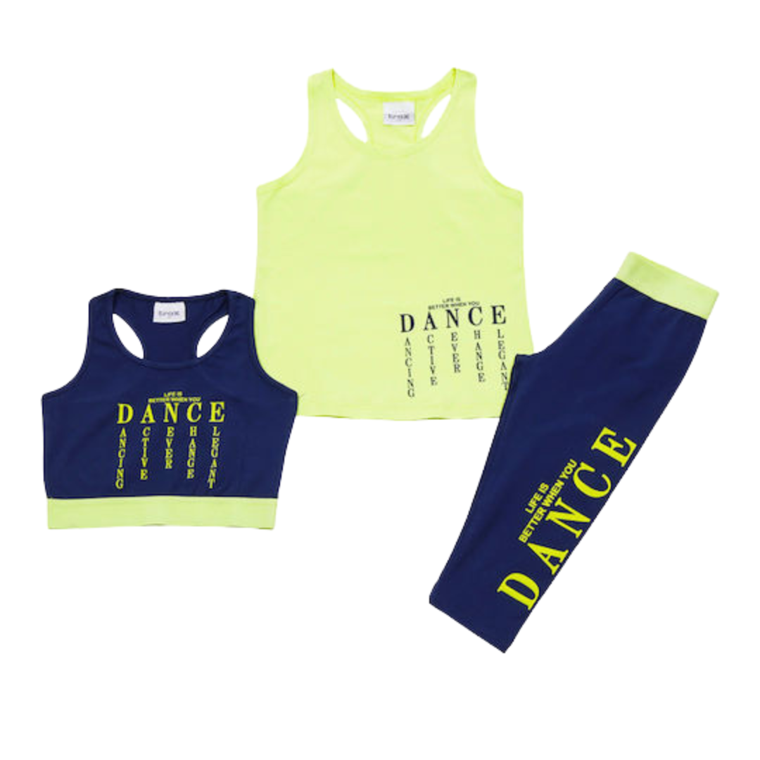 Σετ 3 τεμαχίων, βαμβακερό, της εταιρείας Τrax, με κολάν κάπρι σε χρώμα μπλε με τύπωμα στο μπατζάκι, μπουστάκι σε χρώμα μπλε με τύπωμα και μπλουζα σε χρώμα λάιμ με τυπωμα. 100% Cotton
